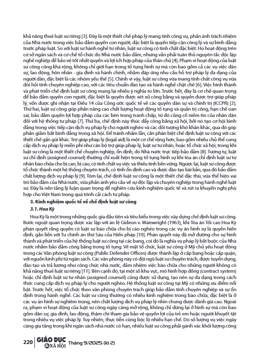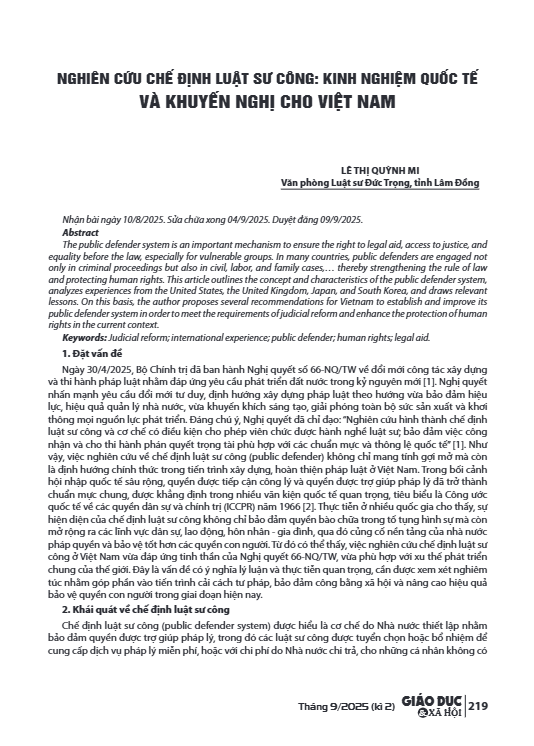 Văn phòng Luật sư Đức Trọng hân hạnh giới thiệu nghiên cứu khoa học của Luật sư Lê Thị Quỳnh Mi, được công bố trên Tạp chí Giáo dục & Xã hội, số 174 (235), tháng 9/2025, (kì 2), với tựa đề: “Nghiên cứu chế định Luật sư công: Kinh nghiệm quốc tế và khuyến nghị cho Việt Nam”